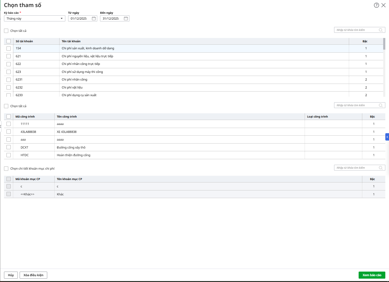 - Ghi nhận chi phí công trình theo từng khoản mục chi phí