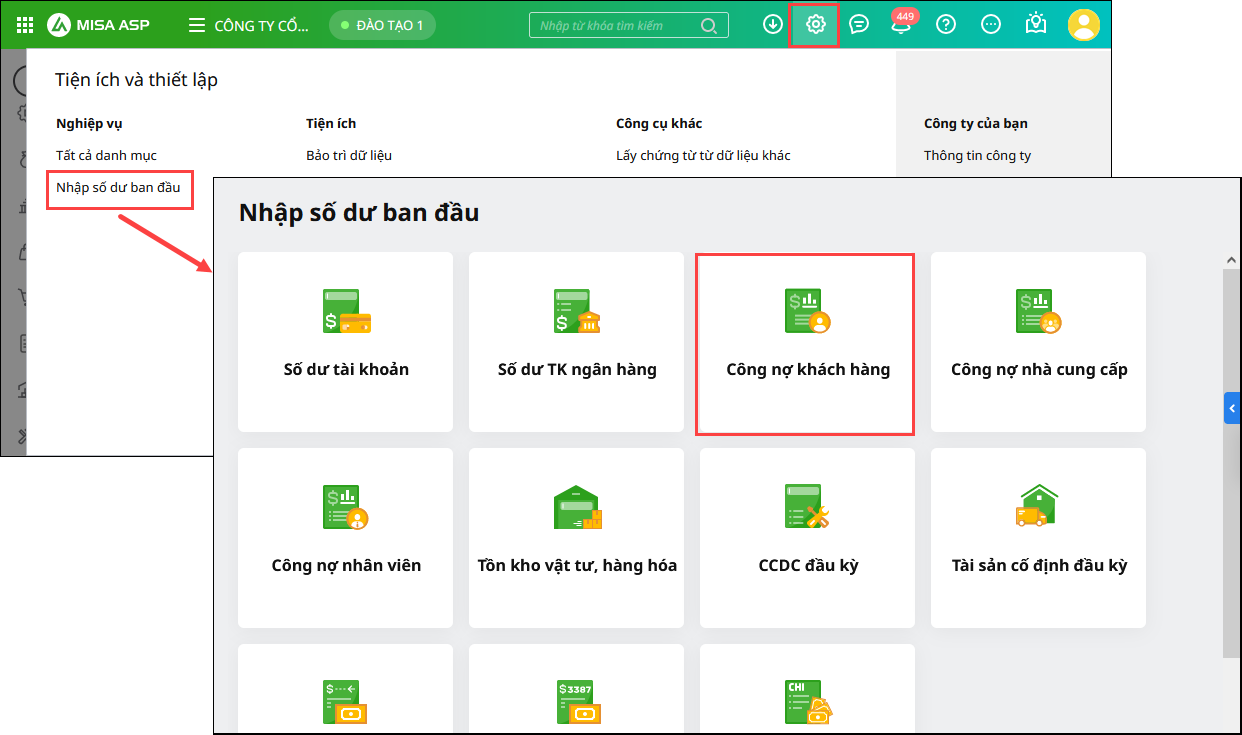 • Vào menu Tiện ích và thiết lập\Nhập số dư ban đầu\tab Công nợ khách hàng (hoặc tab Công nợ nhà cung cấp).
