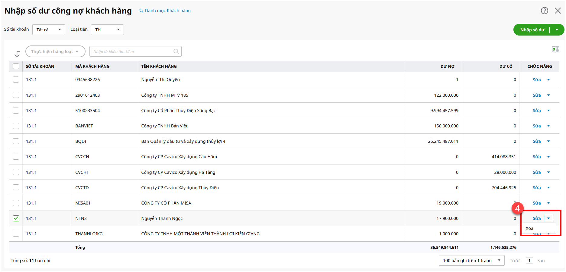 • Xóa bỏ số dư công nợ khách hàng (hoặc công nợ nhà cung cấp) của nhân viên.