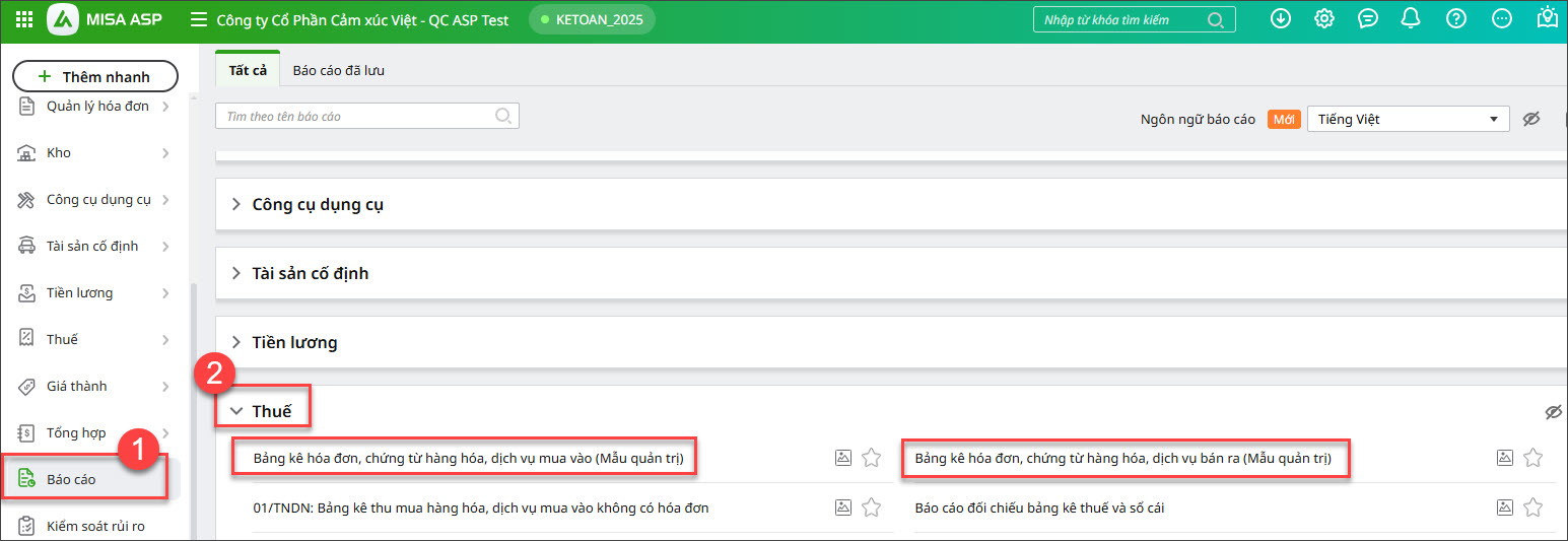 - Vào Báo cáo / Thuế/ xem mẫu: Bảng kê hoá đơn, chứng từ, hàng hoá dịch vụ mua vào (Mẫu quản trị) và Bảng kê hoá đơn, chứng từ, hàng hoá dịch vụ bán ra (Mẫu quản trị)