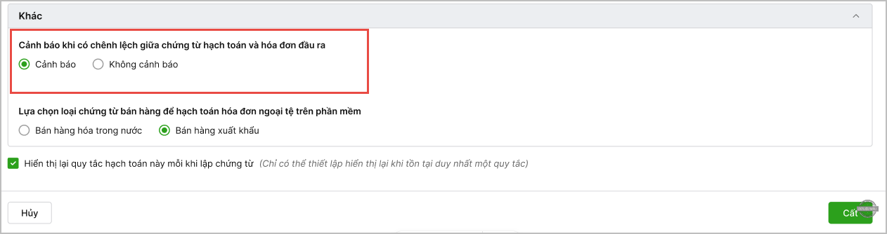 Tại đây, người dùng có thể thiết lập Cảnh báo khi có chênh lệch giữa chứng từ hạch toán và hóa đơn đầu ra hoặc không cảnh báo.