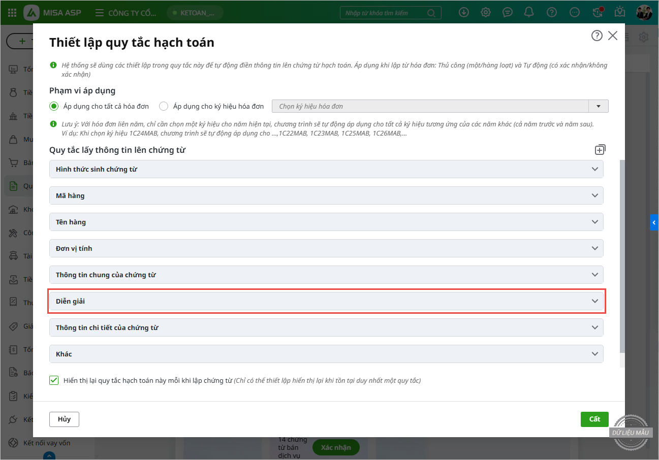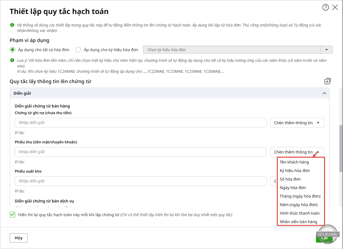 Trên form Quy tắc lấy thông tin lên chứng từ, chọn mục Diễn giải.