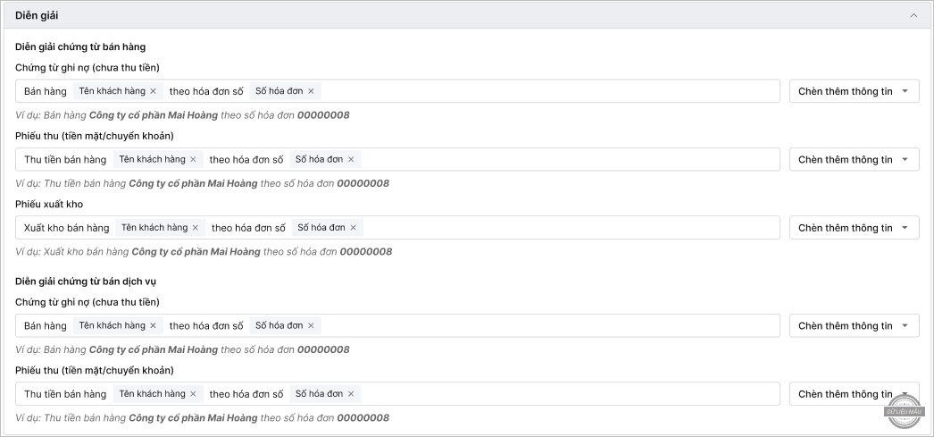 • Tại đây, người dùng có thể thiết lập diễn giải cho các chứng từ bán hàng và chứng từ bán dịch vụ, chi tiết theo: