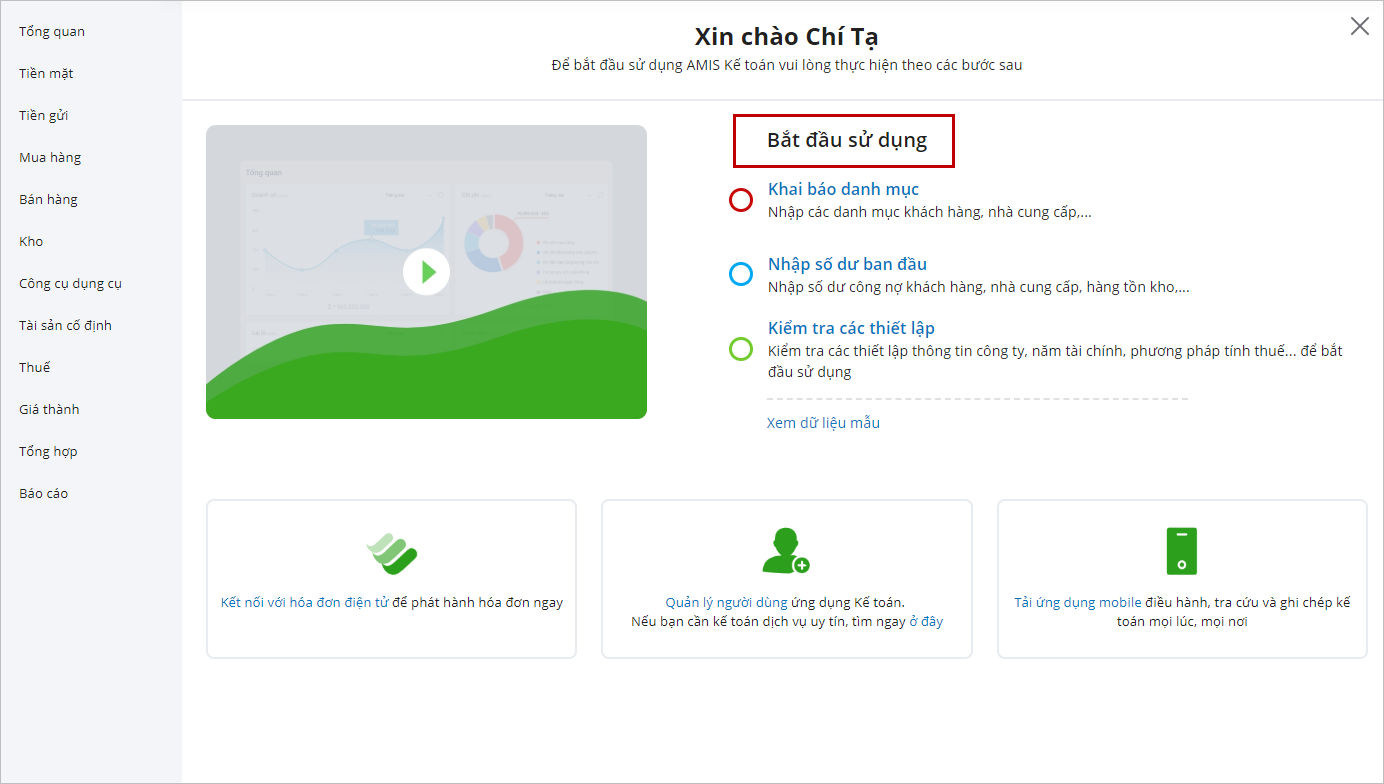 Bước 3: Nhấn Bắt đầu sử dụng và thực hiện các công việc như Khai báo danh mục, Nhập số dư ban đầu.