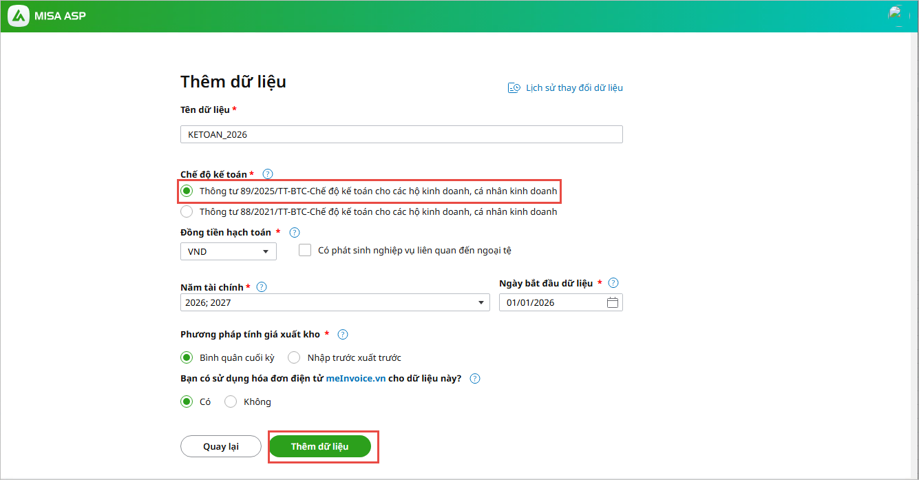 Mục đích: Bài viết hướng dẫn cách tạo dữ liệu mới trên phần mềm MISA ASP Kế toán theo Thông tư 152/2025/TT-BTC để hạch toán cho năm 2026.