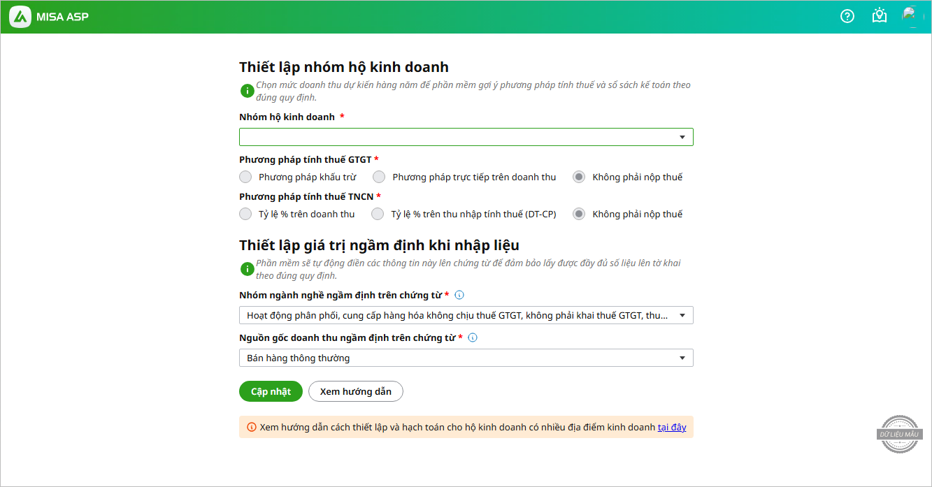 - Phần mềm sẽ hiện thông báo hướng dẫn thiết lập theo nhóm doanh thu tương ứng của Hộ kinh doanh. Người dùng căn cứ vào doanh thu năm và thực hiện chọn nhóm doanh thu tương ứng.
