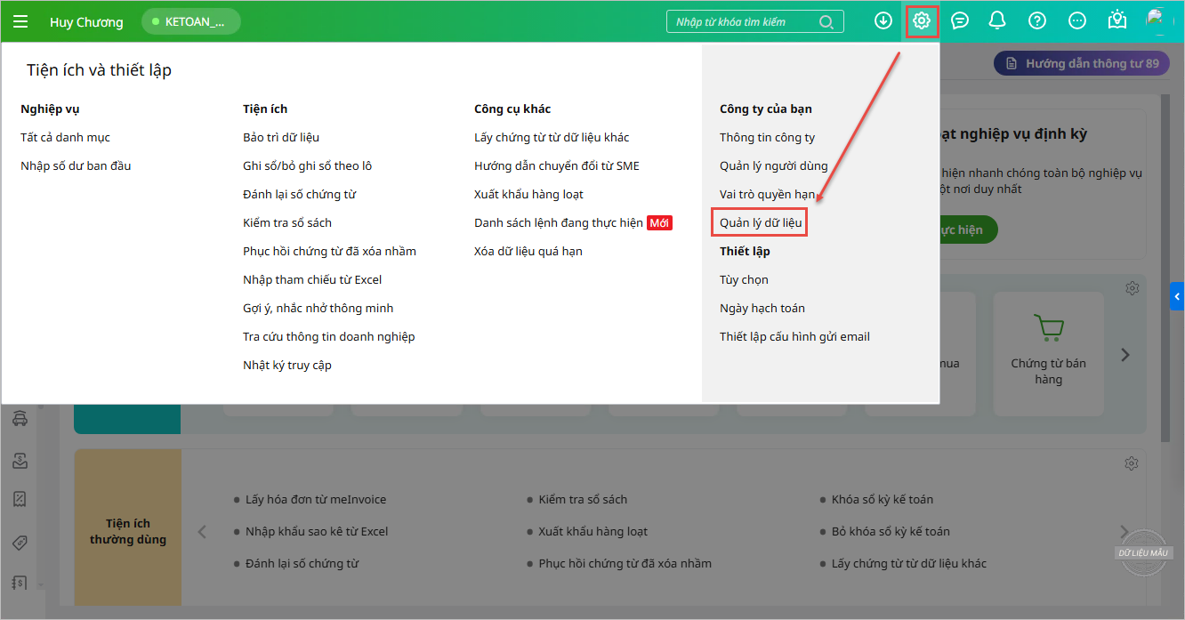 - Vào bánh răng (⚙) Các tiện ích và thiết lập, chọn Quản lý dữ liệu.