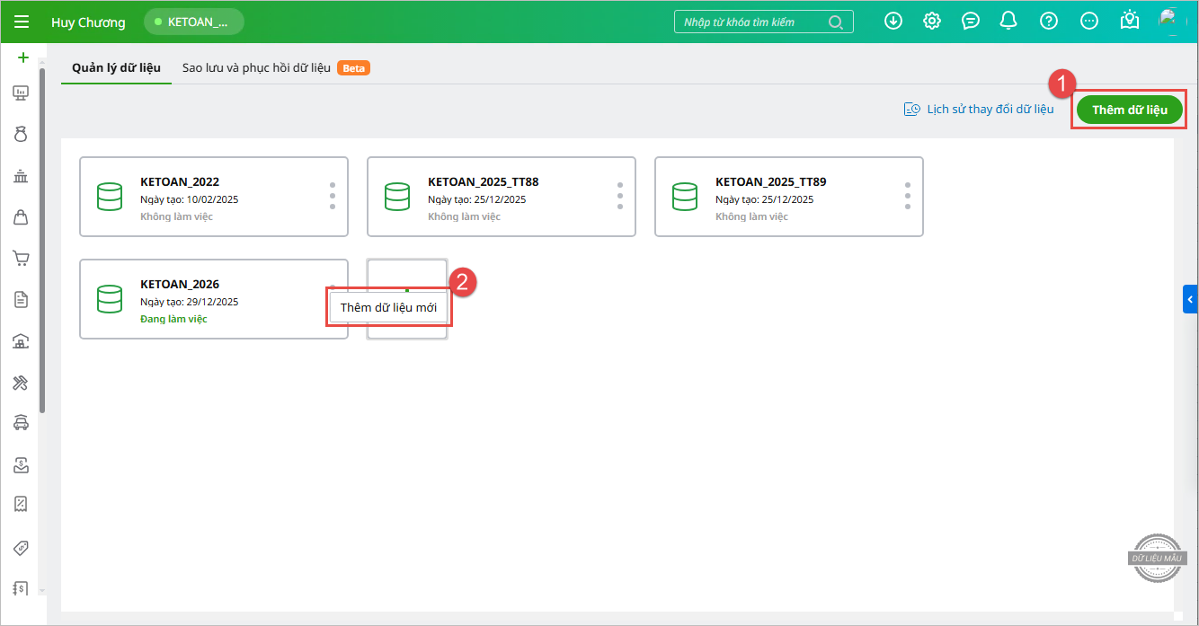 - Nhấn Thêm mới dữ liệu hoặc tích biểu tượng dấu cộng (+) chọn chức năng Thêm dữ liệu mới.
