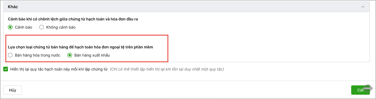- Chọn Bán hàng xuất khẩu : Khi đơn vị phát sinh hóa đơn ngoại tệ từ giao dịch bán hàng hóa/dịch vụ cho khách hàng nước ngoài hoặc tổ chức ở nước ngoài.