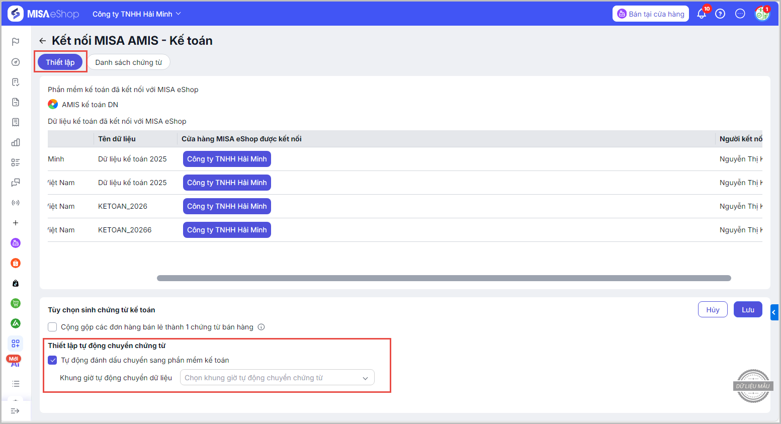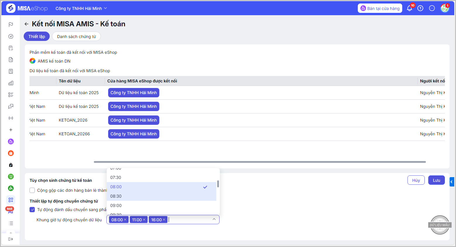 - Nhấn Lưu để hoàn thành. Sau đó, cứ đến khung giờ đã thiết lập thì các chứng từ bán hàng đã phát sinh trên phần mềm MISA eShop sẽ tự động đồng bộ về phần mềm MISA ASP Kế toán và tự động sinh chứng từ.