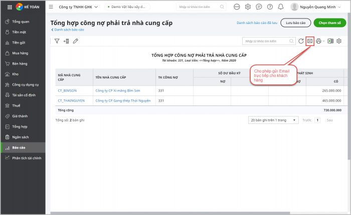 Bước 1: Vào báo cáo bất kỳ, nhấn vào biểu tượng gửi Email như hình dưới để gửi báo cáo trực tiếp cho khách hàng trên phần mềm.