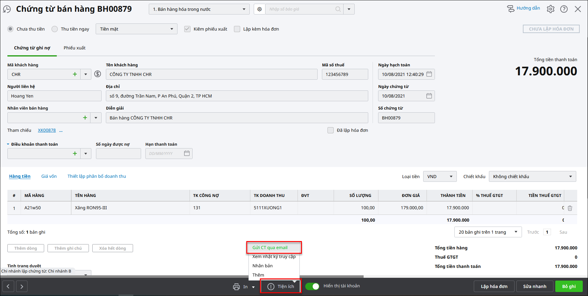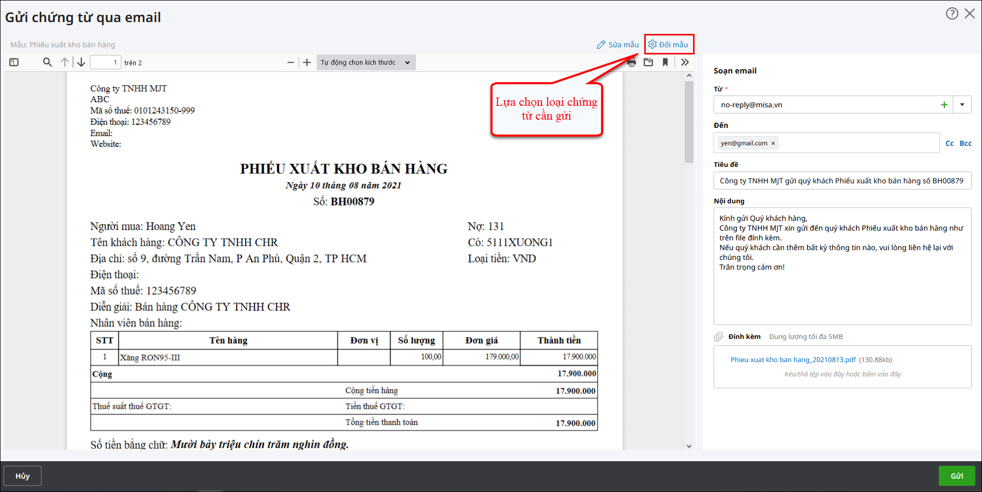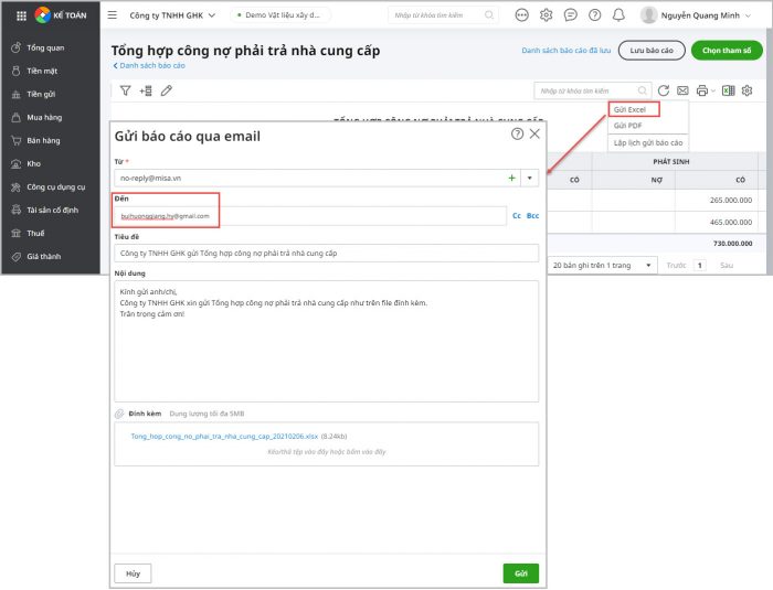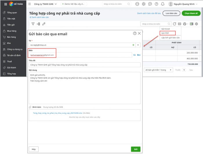 • Các lựa chọn gửi file Excel, PDF hoặc chứng từ qua email.