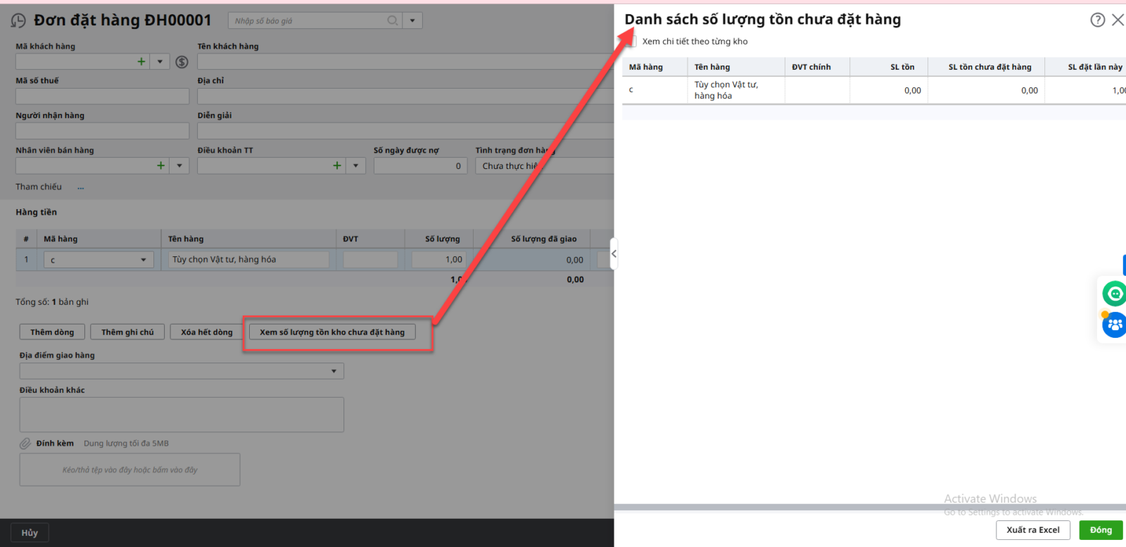 Có thể xem số lượng tồn kho chưa đặt hàng bằng cách:  Mở chứng từ Đơn đặt hàng \Nhấn Xem Số lượng tồn kho chưa đặt hàng