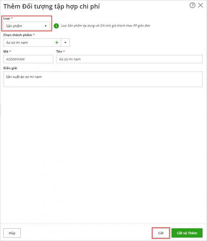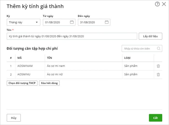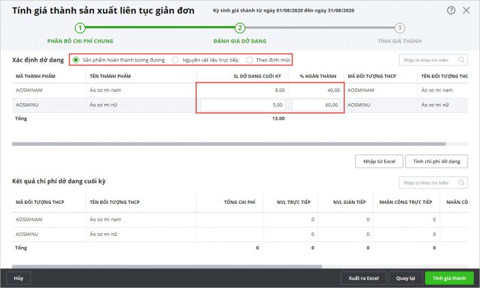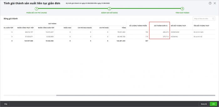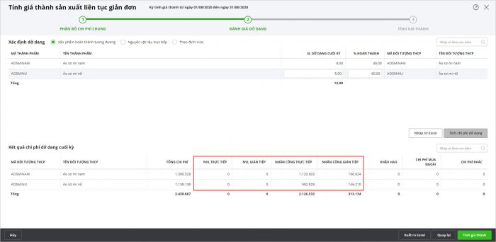 2.5 Nhập kho thành phẩm sản xuấtBước 1. Vào phân hệ Kho tab Nhập, xuất kho, chọn chức năng Thêm\Nhập kho. Bước 3. Khai báo thành phẩm được nhập kho. Lưu ý: Đơn giá của thành phẩm nhập kho sẽ được hệ thống cập nhật sau khi thực hiện chức năng Cập nhật giá nhập kho khi thực hiện Tính giá thành tại Bước 2.7. 2.6 Xác định kỳ tính giá thànhBước 1. Vào phân hệ Giá thành tab Sản xuất liên tục – Giản đơn, chọn chức năng Thêm kỳ tính giá. Lưu ý: Sử dụng chức năng Chọn/Loại bỏ để chọn bổ sung hoặc xóa các đối tượng THCP trên danh sách. 2.7 Tính giá thành thành phẩmBước 1. Với các doanh nghiệp tính giá xuất kho theo phương pháp Bình quân cuối kỳ, trước khi thực hiện tính giá thành cần phải thực hiện chức năng Tính giá xuất kho trên phân hệ Kho. Bước 2. Vào phân hệ Giá thành tab Sản xuất liên tục – Giản đơn. Bước 3. Chọn kỳ tính giá thành trên danh sách và chọn chức năng Tính giá thành bên thanh tác nghiệp (hoặc chọn ⏷ cột chức năng \Tính giá thành).