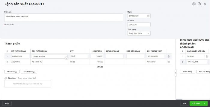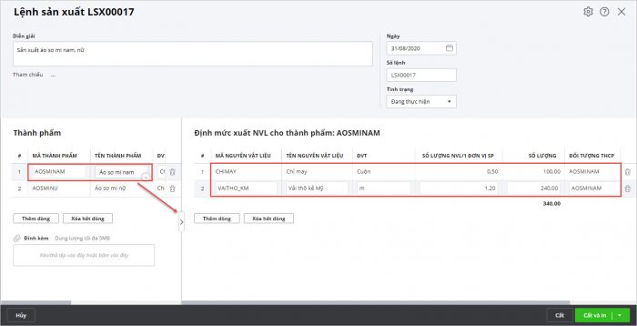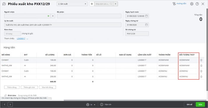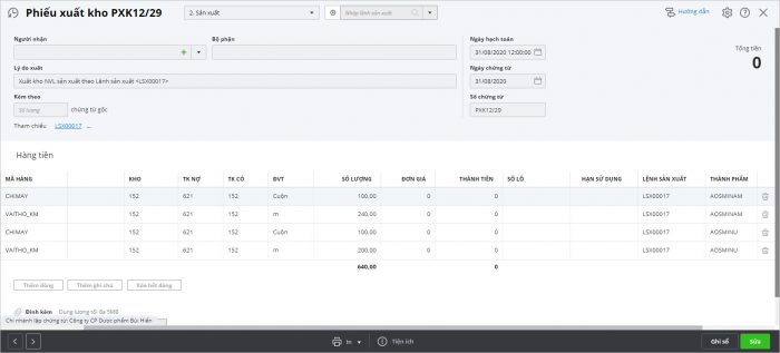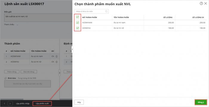 Lưu ý: Với phương pháp tính giá giản đơn, mỗi đối tượng tập hợp chi phí sẽ tương ứng với một thành phẩm cần sản xuất ra. 2.3 Xuất kho nguyên vật liệu sản xuấtBước 1. Vào phân hệ Kho tab Lệnh sản xuất, chọn chức năng Thêm lệnh sản xuất. Bước 3. Chọn các thành phẩm và nhập số lượng cần sản xuất. Bước 6. Chọn chức năng Lập phiếu xuất trên lệnh sản xuất. Bước 7. Tích chọn các thành phẩm cần xuất NVL, nhấn Đồng ý. Lưu ý:
