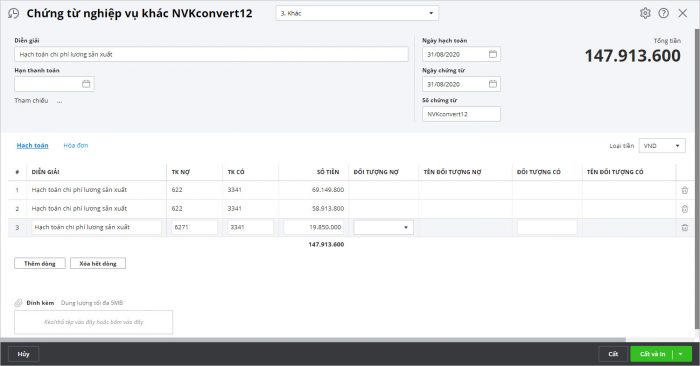 2.4 Hạch toán các chi phí phát sinhCác chi phí phát sinh liên quan đến việc tính giá thành (Nợ TK 621, 622, 623, 627, 154) có thể được hạch toán trên phân hệ Tiền mặt, Tiền gửi hoặc Tổng hợp.