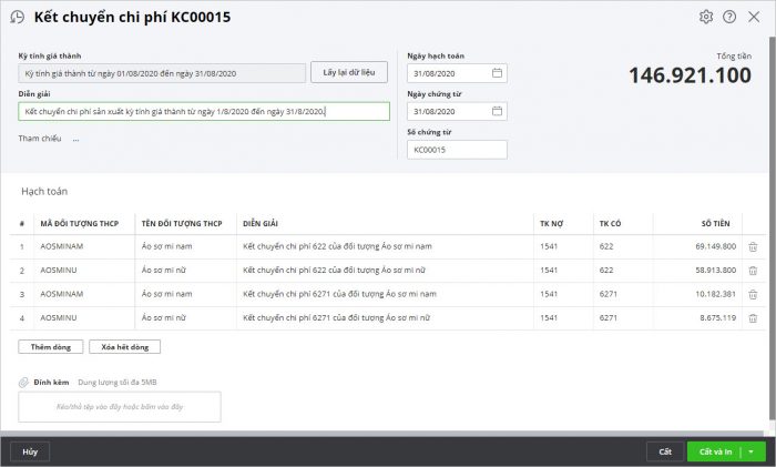 2.8 Kết chuyển chi phíBước 1. Vào phân hệ Giá thành tab Sản xuất liên tục – Giản đơn. Bước 2. Chọn kỳ tính giá thành trên danh sách và chọn chức năng Kết chuyển chi phí (hoặc trên phân hệ Giá thành\Quy trình\Sản xuất liên tục, giản đơn, chọn chức năng Kết chuyển chi phí). Bước 4. Kiểm tra chứng từ kết chuyển chi phí. Lưu ý: Xem chi tiết việc thực hiện tính giá thành hàng gia công theo hướng dẫn tại đây. |