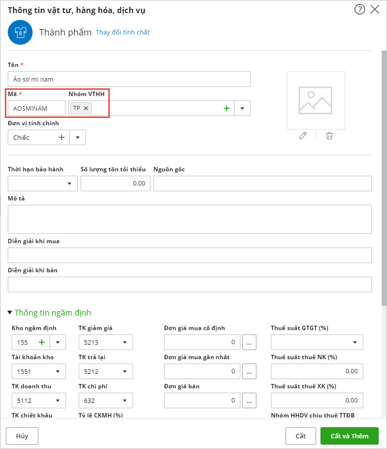 • Nếu khai báo nguyên vật liệu, sẽ chọn tính chất là Vật tư hàng hoá.