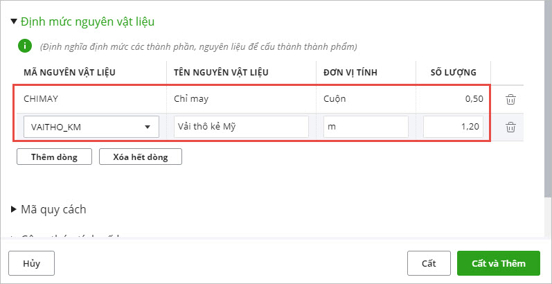 Lưu ý: Khi khai báo thành phẩm, thực hiện khai báo thêm định mức nguyên vật liệu sử dụng để sản xuất ra thành phẩm bên tab Định mức nguyên vật liệu.