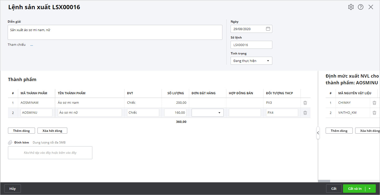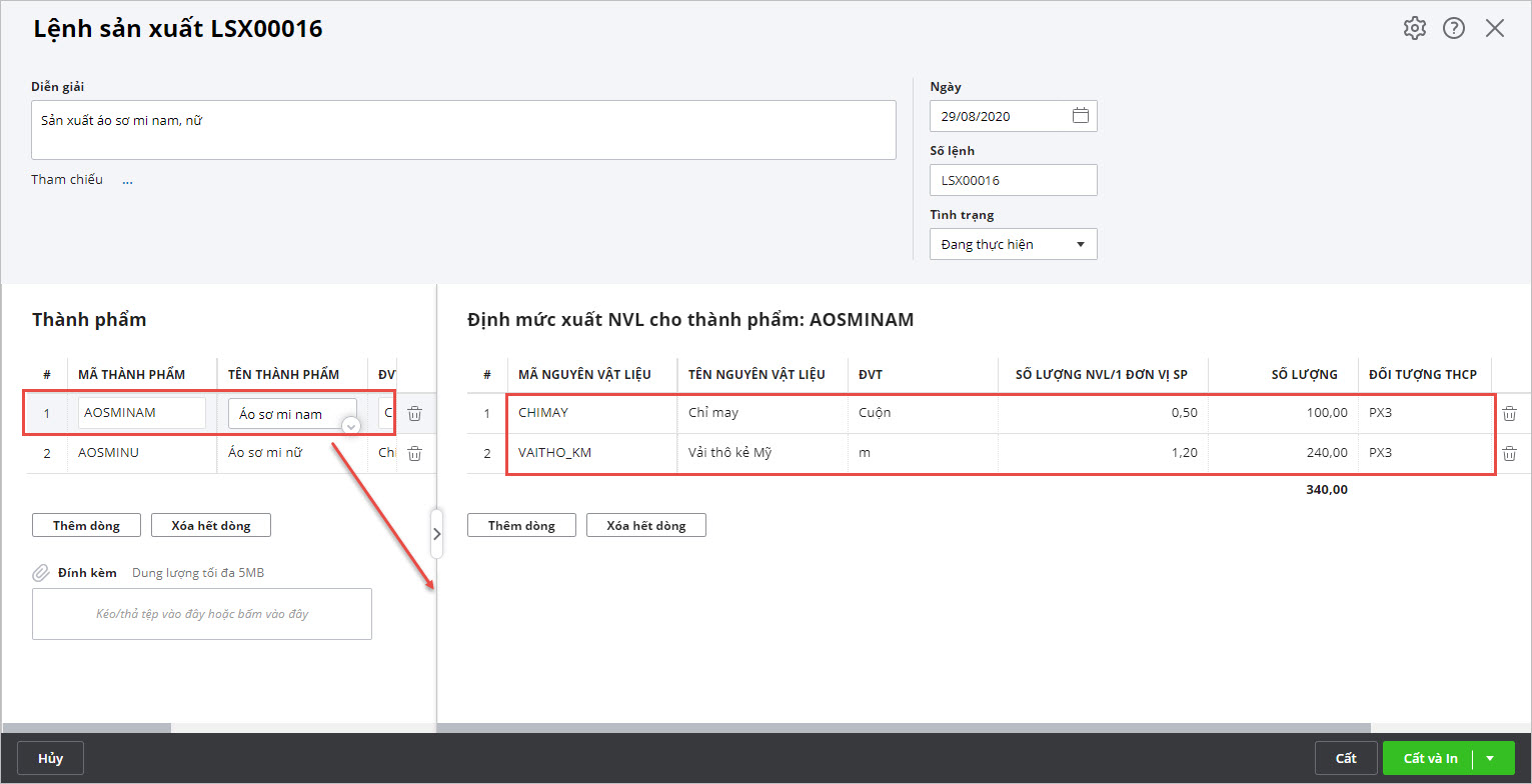Bước 3: Chọn các thành phẩm và nhập số lượng cần sản xuất,