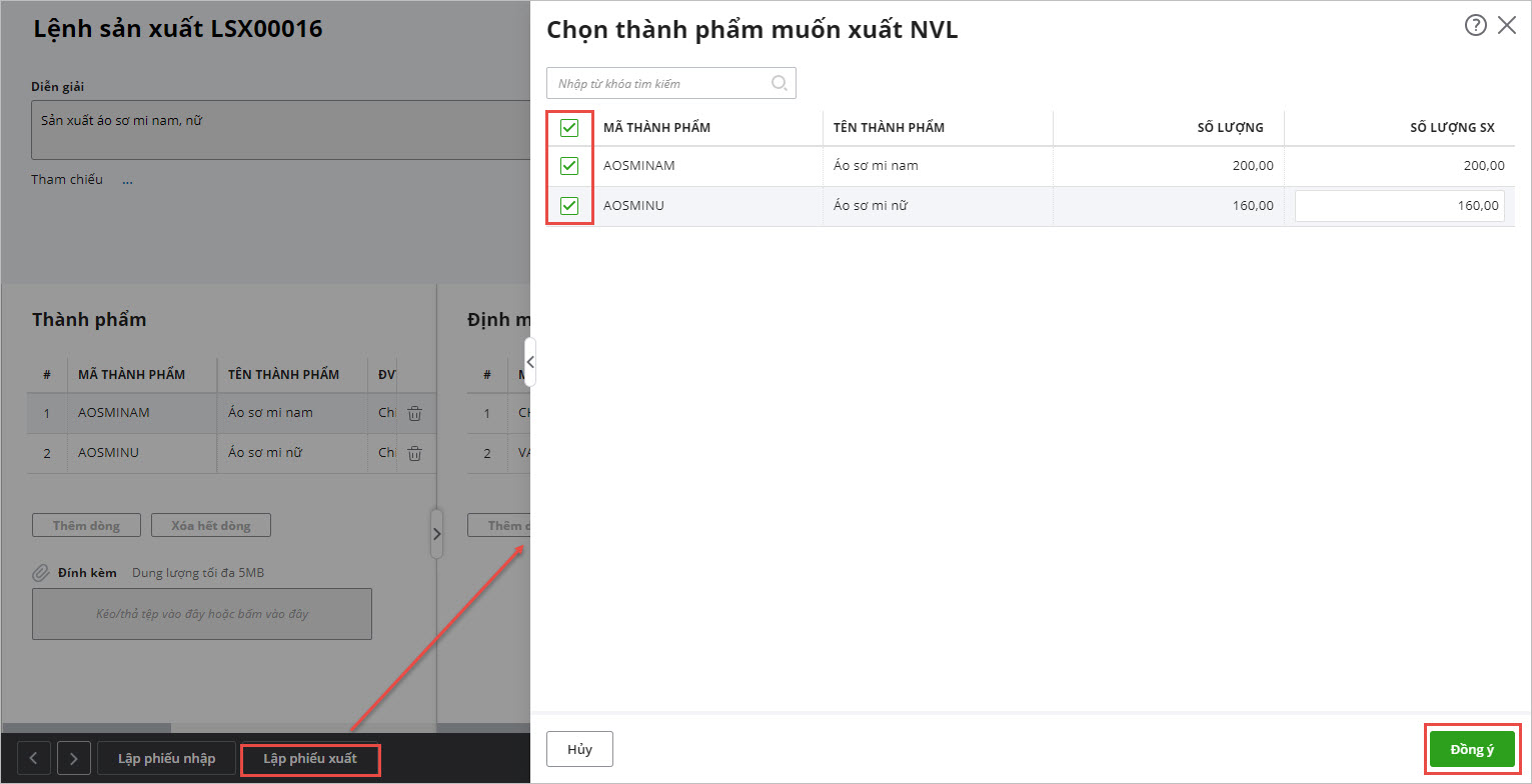 • Tích chọn các thành phẩm cần xuất NVL, nhấn Đồng ý.