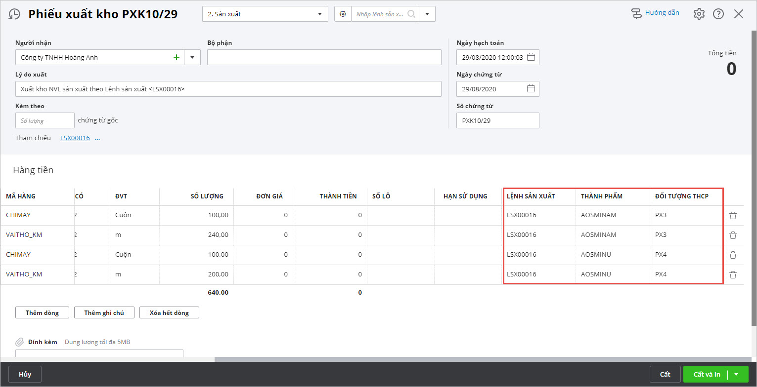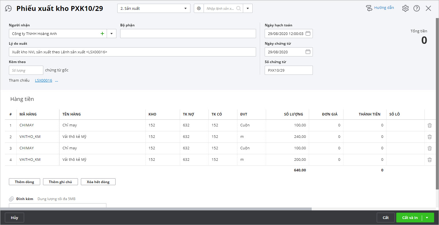 • Với những doanh nghiệp không quản lý lệnh sản xuất có thể bỏ qua bước này và vào phân hệ Kho\tab Nhập, xuất kho để lập chứng từ xuất kho sản xuất.