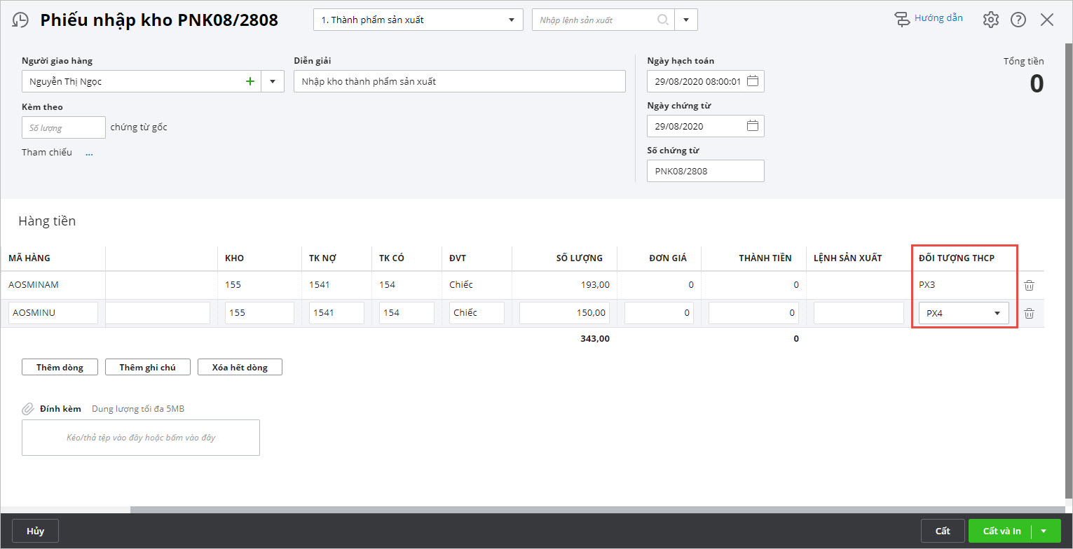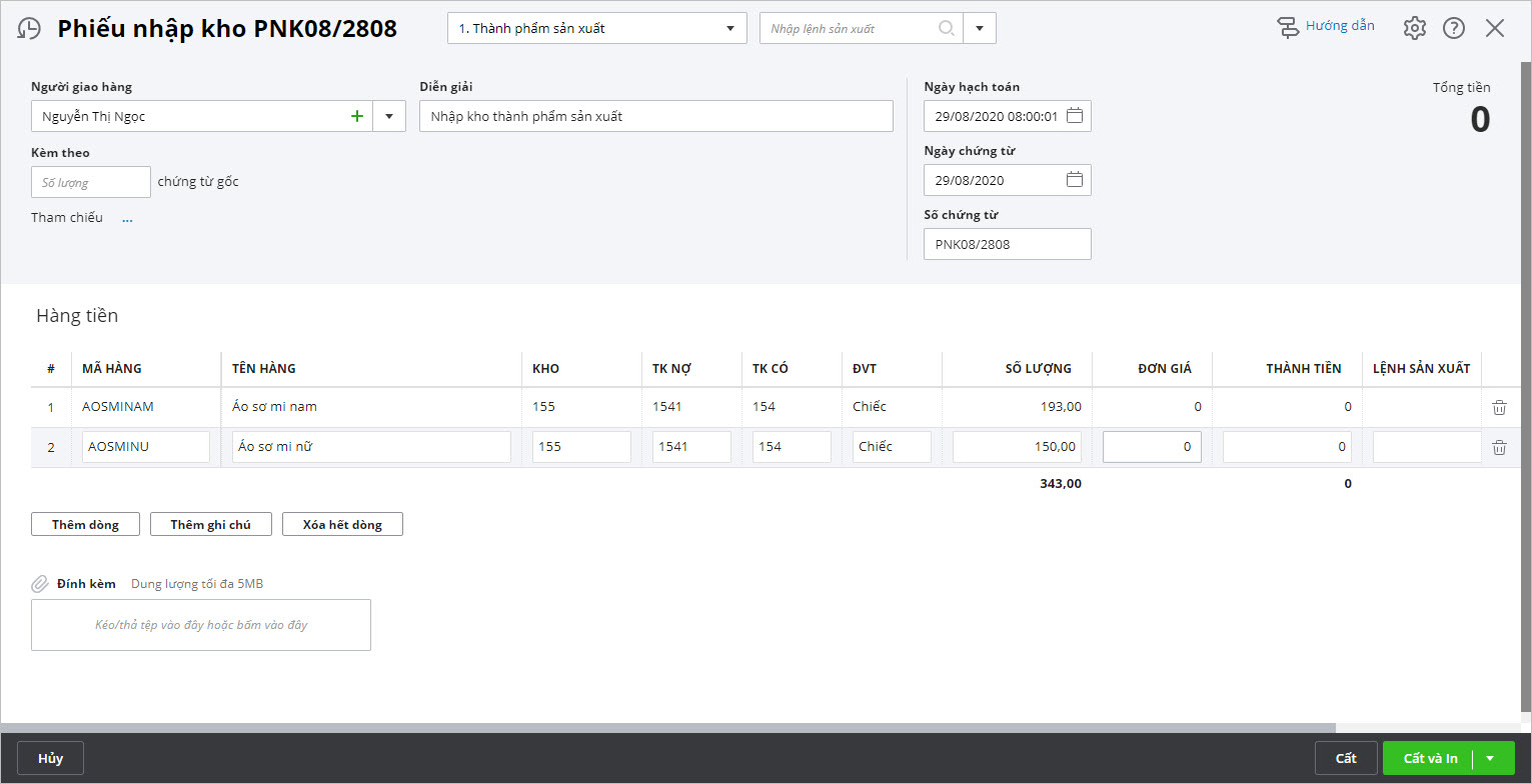 Lưu ý: Đơn giá của thành phẩm nhập kho sẽ được hệ thống cập nhật sau khi thực hiện chức năng Cập nhật giá nhập kho khi thực hiện Tính giá thành tại 3.8.