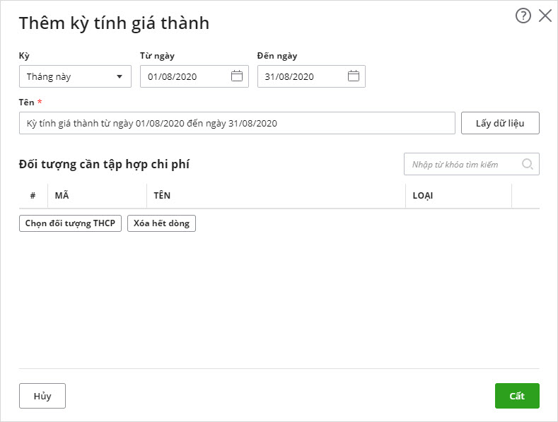Bước 2: Chọn kỳ tính giá thành và nhấn nút Lấy dữ liệu, phần mềm sẽ tự động lấy lên những đối tượng THCP phát sinh trong kỳ đã khai báo.