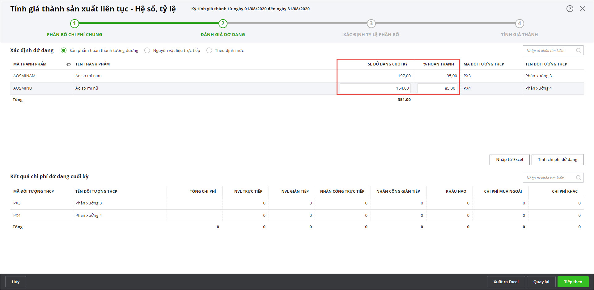 • Lựa chọn tiêu thức đánh giá dở dang và nhập số lượng dở dang kèm tỷ lệ hoàn thành của các thành phẩm dở dang.