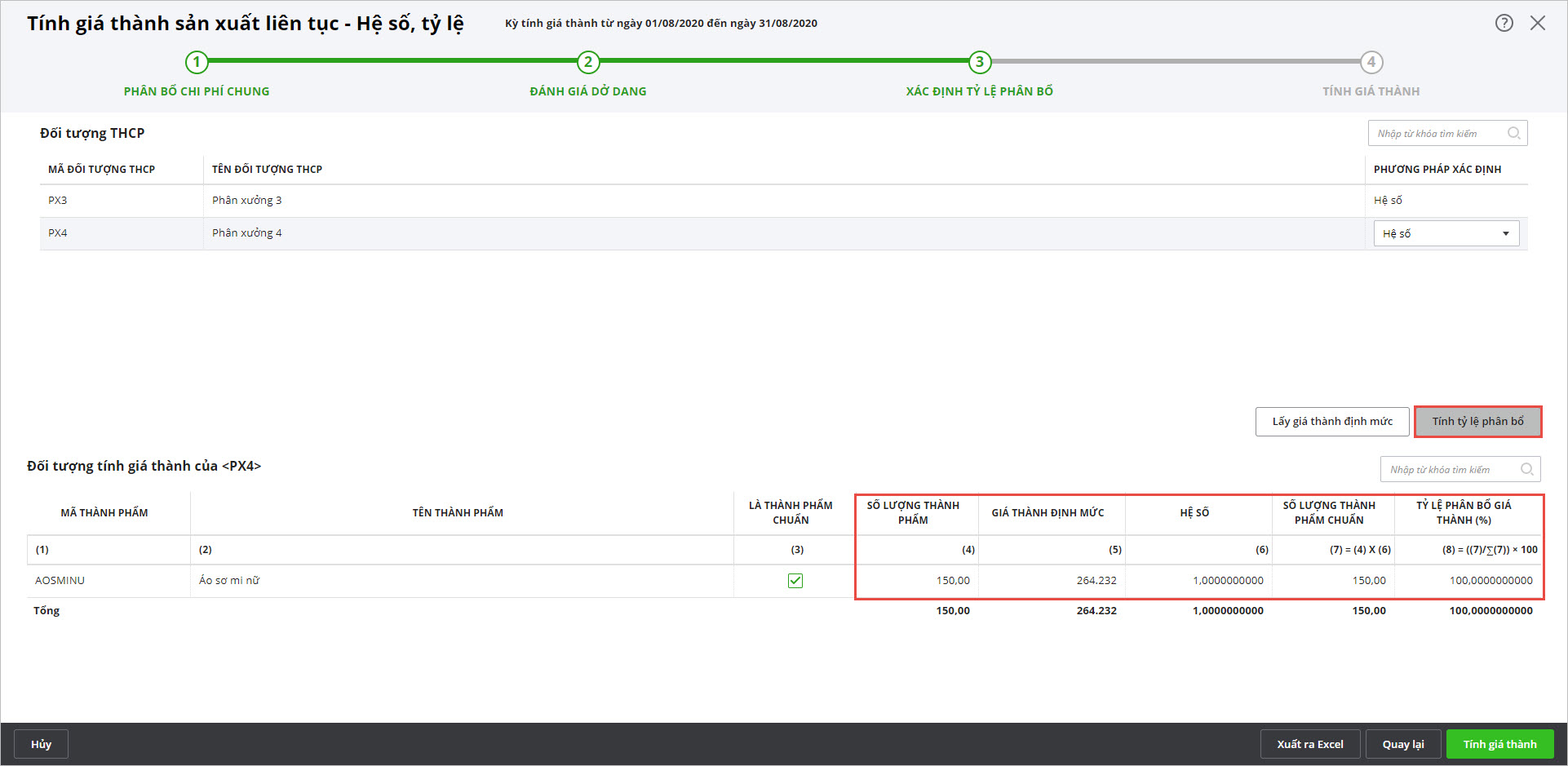 • Nhấn Tính tỷ lệ phân bổ, hệ thống tự động tính tỷ lệ phân bổ cho từng thành phẩm thuộc đối tượng tính giá thành.