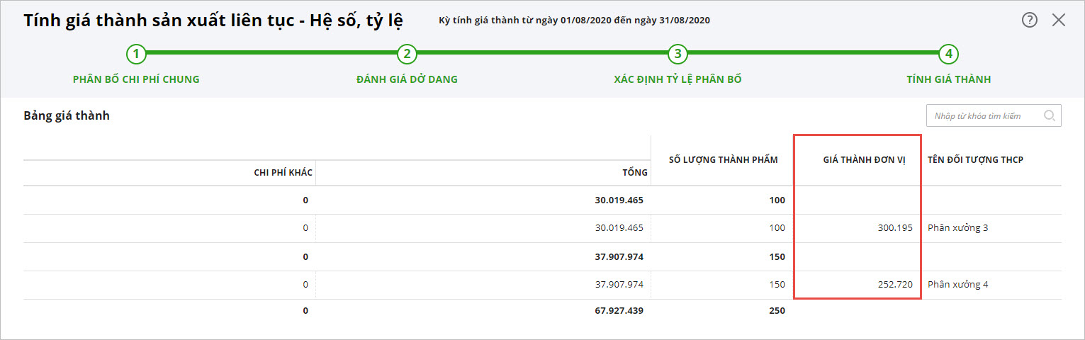 Bước 4: Tính giá thành: hệ thống tự động tính ra giá thành cho từng đối tượng THCP.