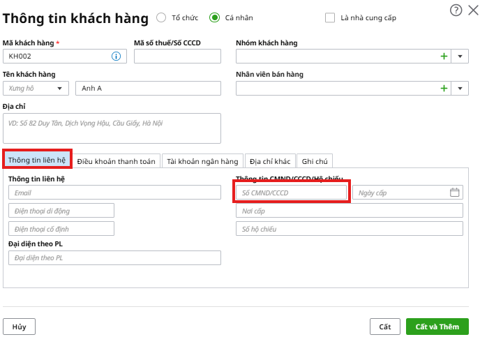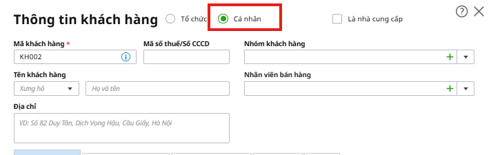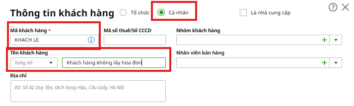 - Khi lập Chứng từ bán hàng, chọn đúng mã khách hàng cá nhân đã tạo.