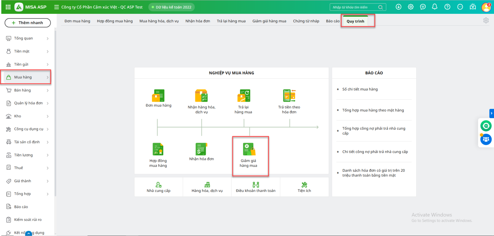 Bước 1: Vào phân hệ Mua hàng\Quy trình, chọn chức năng Giảm giá hàng mua