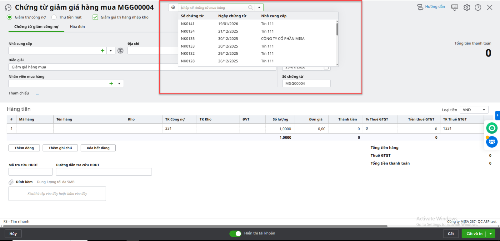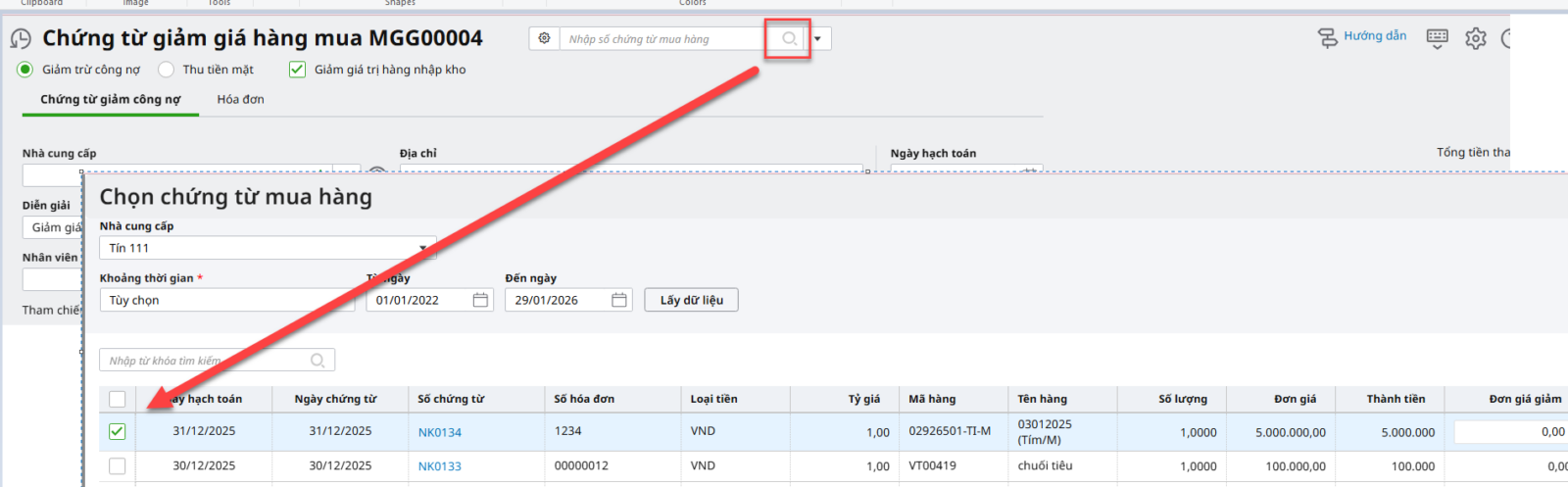 Bước 4: Chọn chứng từ mua hàng có mặt hàng chiết khấu theo một trong hai cách