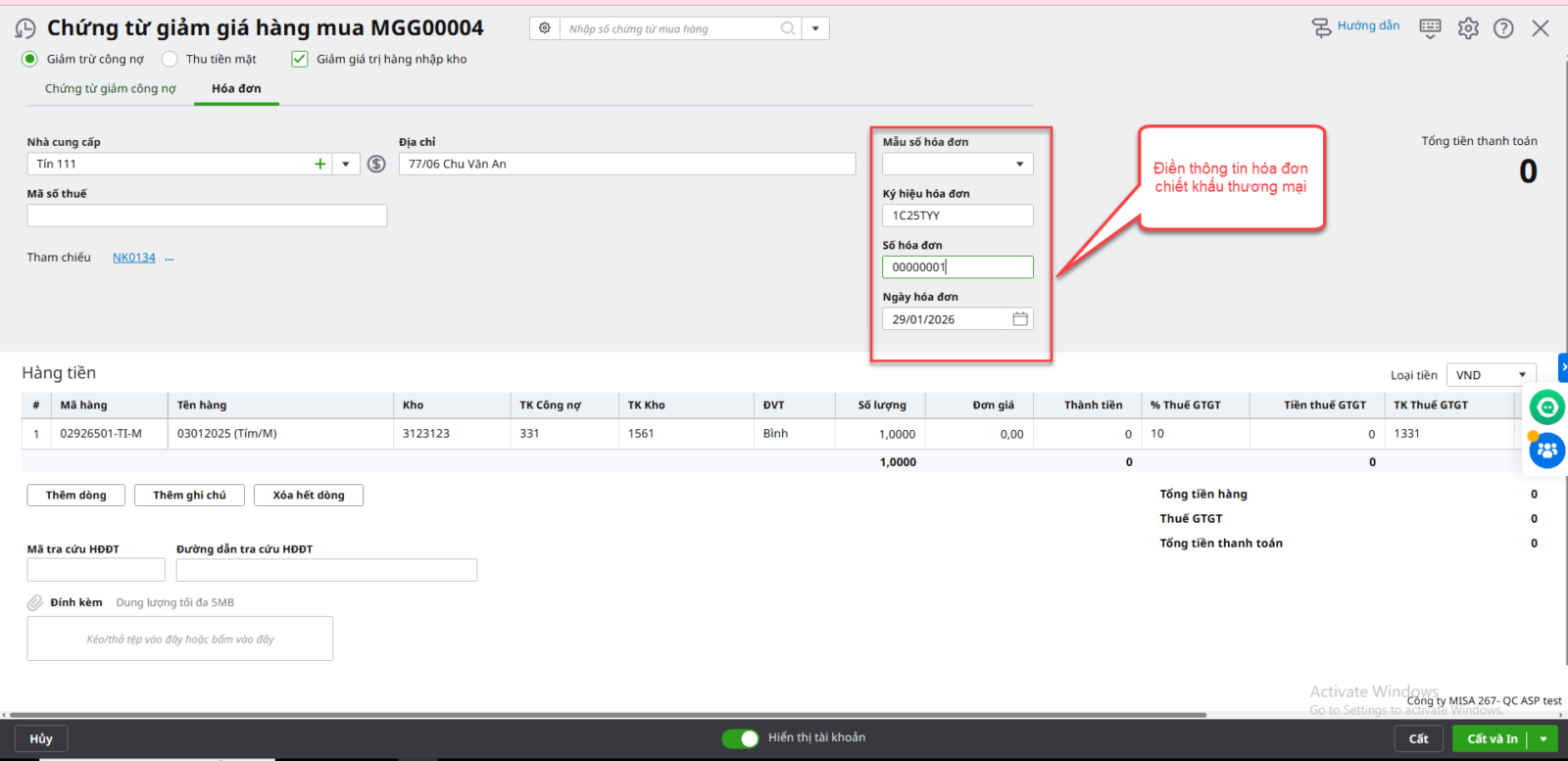 • Tại tab Hoá đơn, nhập tay thông tin của Hóa đơn chiết khấu thương mại vào (Ký hiệu HĐ, Số HĐ, Ngày HĐ)