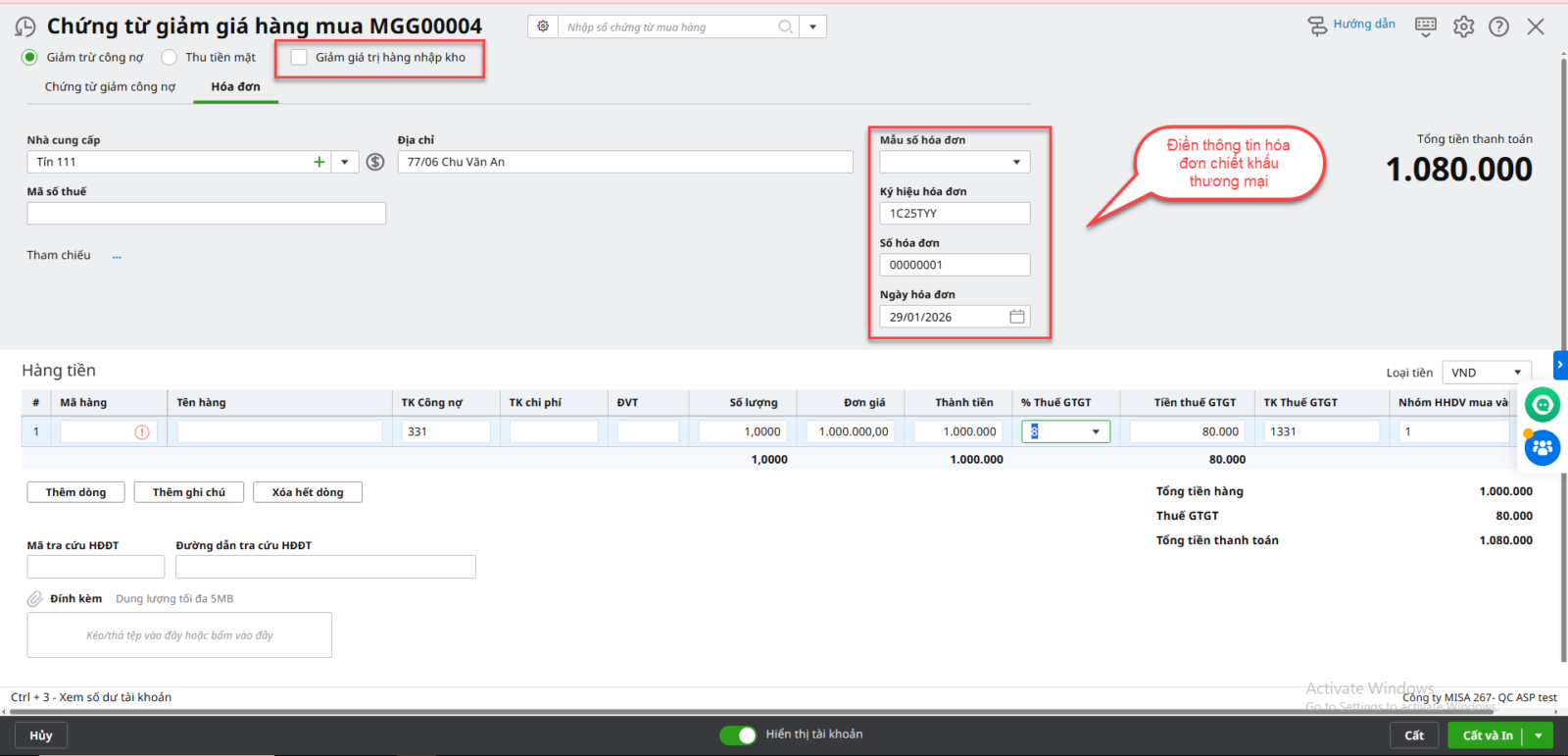• Vào chứng từ Giảm giá hàng mua hạch toán Giảm giá trị tồn kho và giảm Tiền thuế GTGT đầu vào