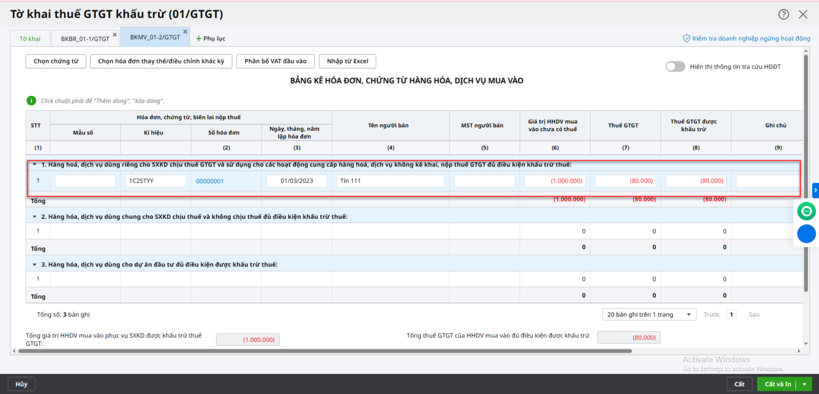 Ví dụ: Ngày 01/03/2023, đơn vị nhận được hóa đơn chiết khấu thương mại số 0000001 số tiền chiết khấu tháng 2. Tại tờ khai thuế tháng 3 thực hiện kê khai hóa đơn 0000001 lên bảng kê.