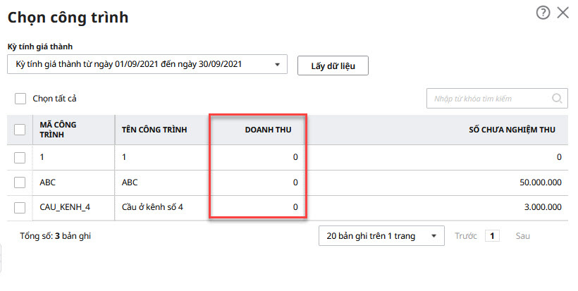 Biểu hiện: Khi thao tác Nghiệm thu công trình ở phân hệ giá thành nhưng cột doanh thu của công trình không thể hiện giá trị
