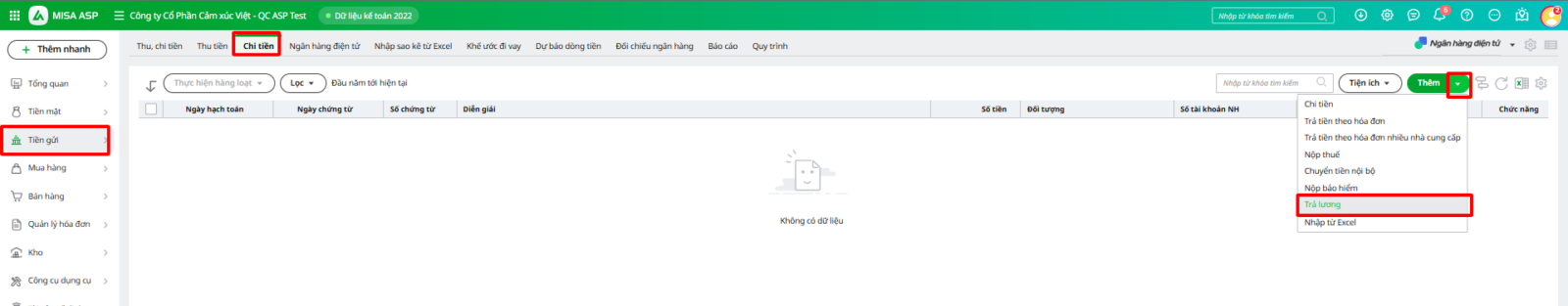 Bước 1: Vào phân hệ Tiền gửi tab Chi tiền, nhấn vào biểu tượng ⏷bên chức năng Thêm, chọn Trả lương.