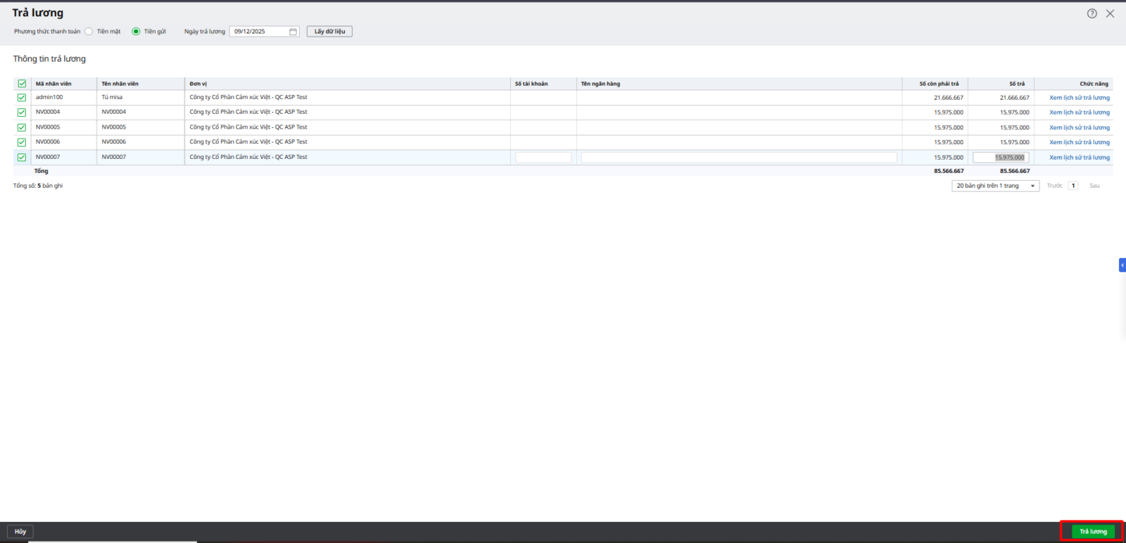 Bước 2: Khai báo thông tin trả lương, tích chọn nhân viên và điền số tiền phải trả, sau đó nhấn Trả lương.