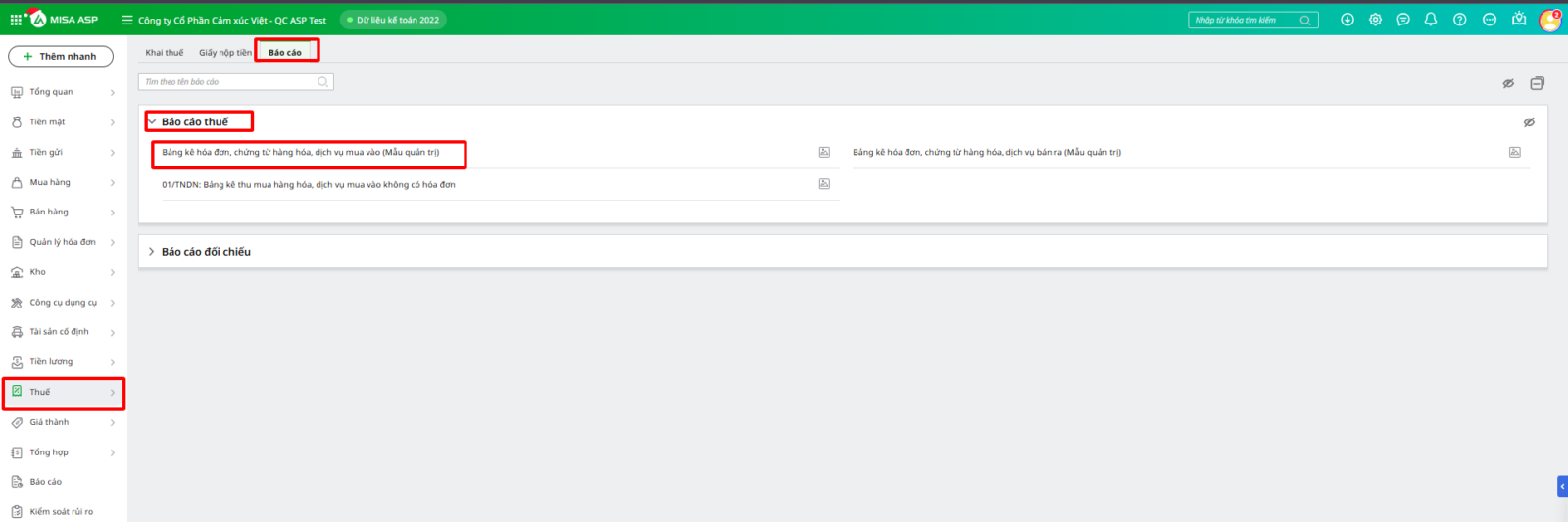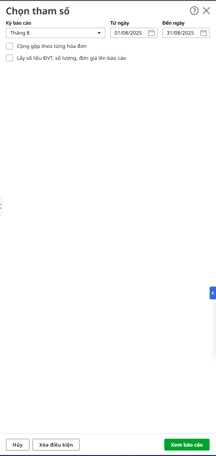 Bước 1: Vào phân hệ Thuế\tab Báo cáo\ Báo cáo Thuế, Chọn Bảng kê hóa đơn, chứng từ hàng hóa, dịch vụ mua vào (Mẫu quản trị) hoặc Bảng kê hóa đơn, chứng từ hàng hóa, dịch vụ bán ra (Mẫu quản trị)