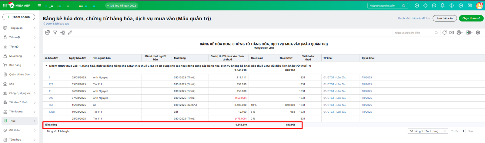 Bước 3: Chương trình bổ sung thông tin Giá trị HHDV mua vào chưa có thuế GTGT và tổng tiền thuế GTGT của từng nhóm hàng hóa dịch vụ trên Bảng kê hóa đơn, chứng từ hàng hóa, dịch vụ mua vào (Mẫu quản trị)