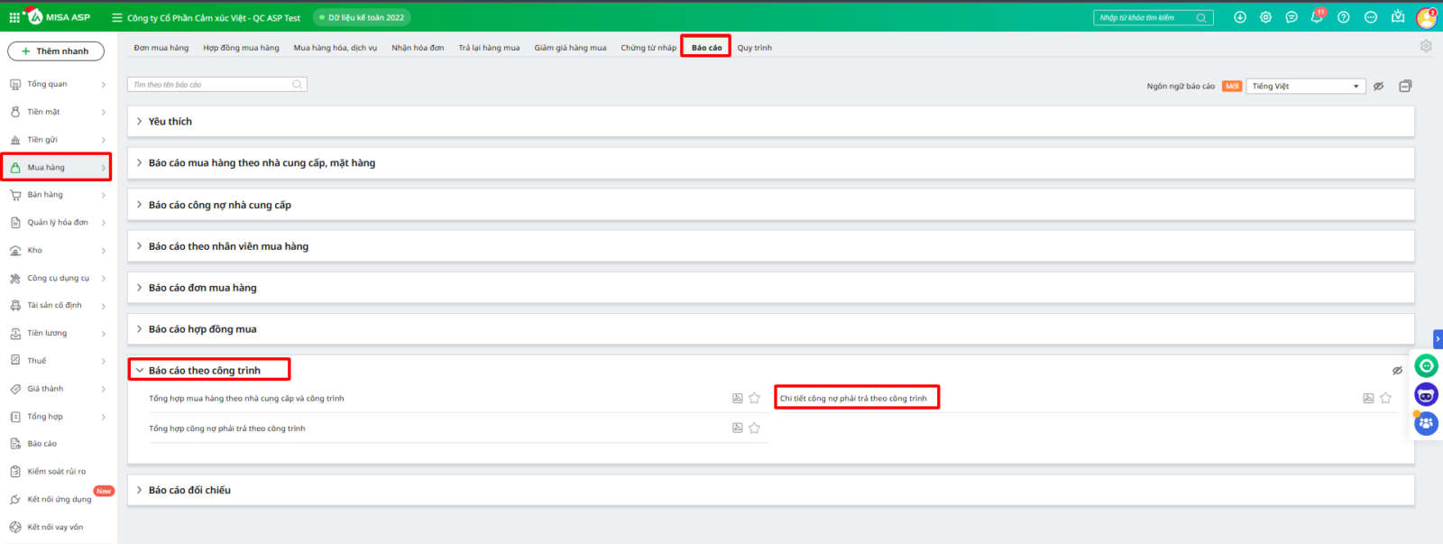 Bước 1: Vào Báo cáo\Mua hàng tại nhóm Báo cáo theo công trình, chọn Chi tiết công nợ phải trả theo công trình.