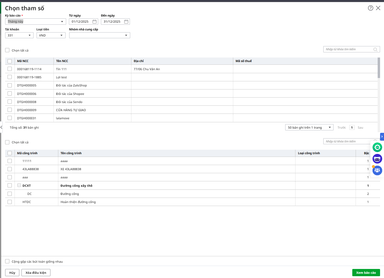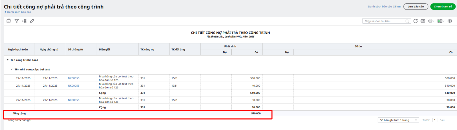 Mục đích: Hướng dẫn về việc hiển thị dòng tổng cộng số dư cuối kỳ của tất cả các công trình trên báo cáo chi tiết công nợ phải trả theo công trình.