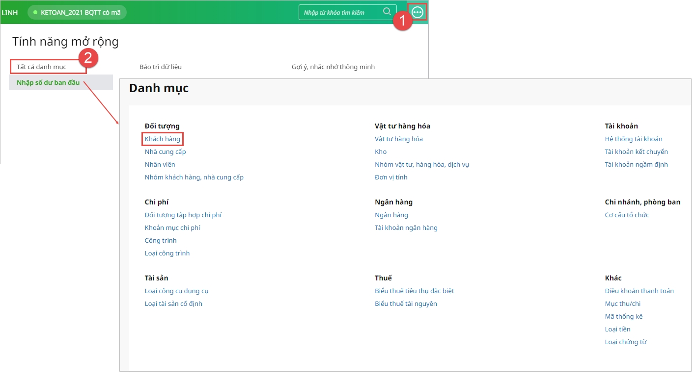 • Vào Tiện ích và thiết lập\Tất cả danh mục, chọn danh mục Khách hàng hoặc Nhà cung cấp: