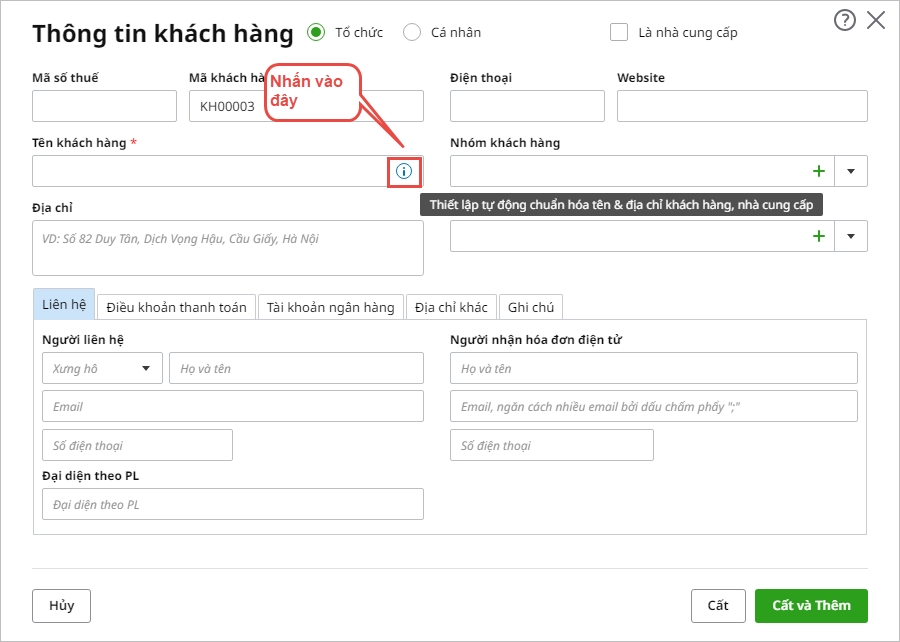 • Trên giao diện Thêm/sửa khách hàng/nhà cung cấp, chương trình bổ sung chức năng Thiết lập tự động chuẩn hóa tên & địa chỉ khách hàng, nhà cung cấp: