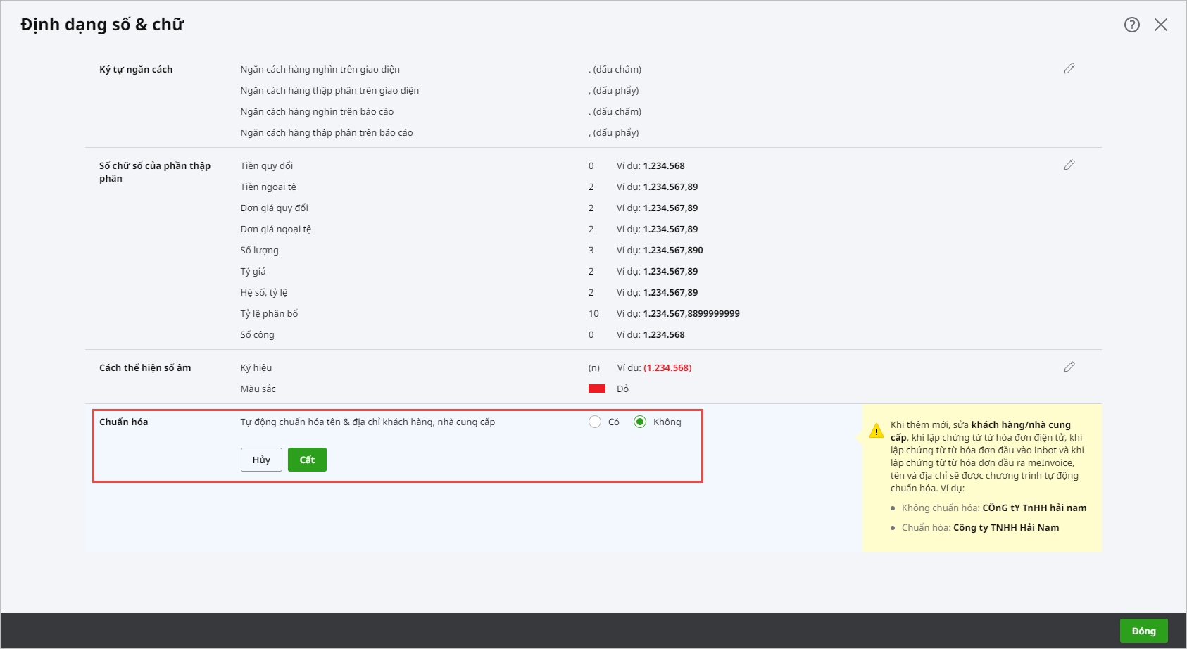 • Trên giao diện tùy chọn Định dạng số & chữ, tại mục Chuẩn hóa, lựa chọn việc có hoặc không Tự động chuẩn hóa tên & địa chỉ khách hàng, nhà cung cấp. Khi thêm mới/sửa khách hàng/nhà cung cấp, khi lập chứng từ từ hóa đơn điện tử, khi lập chứng từ từ hóa đơn đầu vào inbot và khi lập chứng từ từ hóa đơn đầu ra meInvoice, tên và địa chỉ sẽ được chương trình tự động chuẩn hóa.