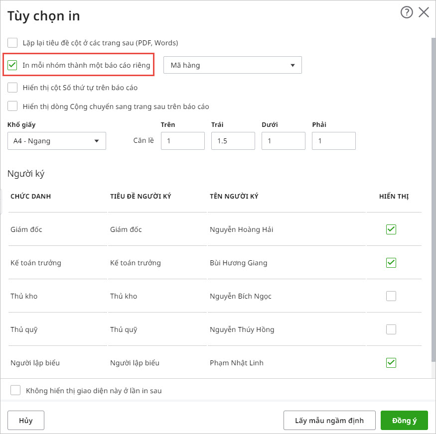 - In mỗi nhóm thành một báo cáo riêng: Đối với báo cáo có nhóm theo cột, nếu muốn in mỗi nhóm thành một báo cáo riêng (tức là lặp lại cả tên và chữ ký cho từng nhóm) thì tích chọn vào tùy chọn này và chọn Nhóm cần tách.