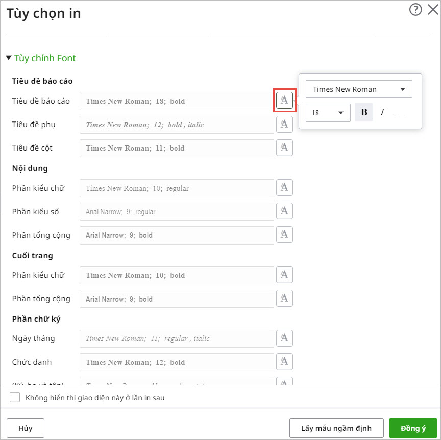 - Tùy chỉnh Font: cho phép tùy chỉnh font cho các thông tin trên báo cáo in ra: