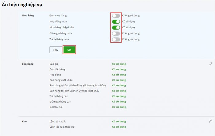 Bước 3: Tùy chỉnh ẩn/hiện các nghiệp vụ theo mong muốn: